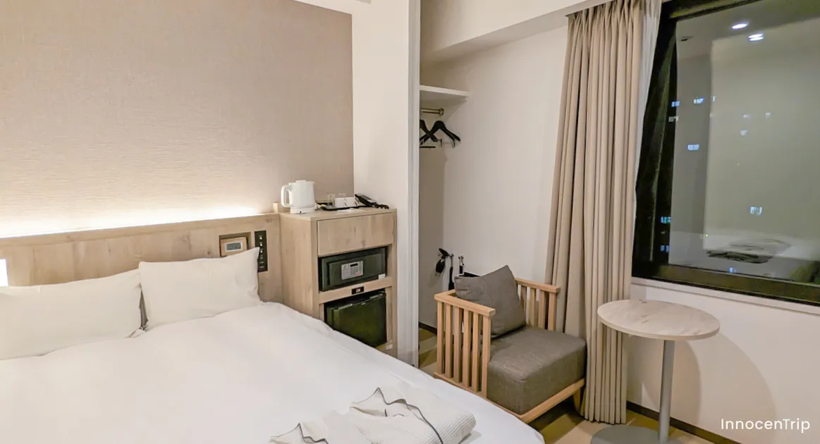 ダブルルームはコンパクトだけど広く使えるように工夫されているなと思うのが、部屋の入り口のドアを開けたらすぐ左手にいきなりベッドがあるところ。